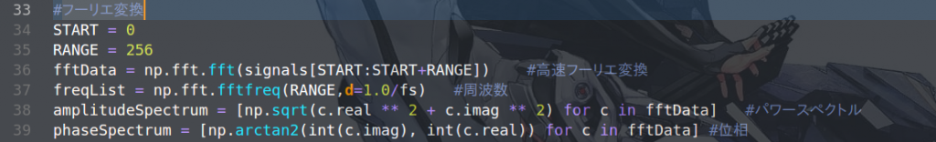 読み込んだデータは時間をx軸、振幅をy軸とした時間領域のデータである。これをフーリエ変換を用いて周波数をx軸、スペクトルパワー(周波数の強さ)をy軸とした周波数領域のデータに変換する。フーリエ変換はPythonを使った人ならお馴染みの”numpy”で容易に可能である。